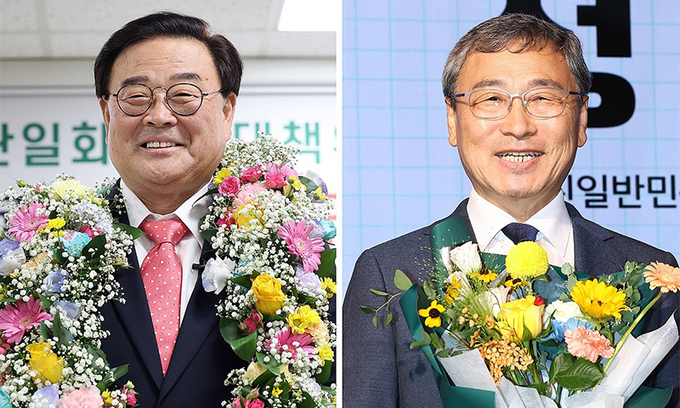 10월 16일 서울시교육감 보궐선거에 중도우파 단일 후보로 추대된 조전혁 전 한나라당 의원(왼쪽), 진보진영 단일화 후보로 확정된 정근식 서울대 명예교수. 연합뉴스