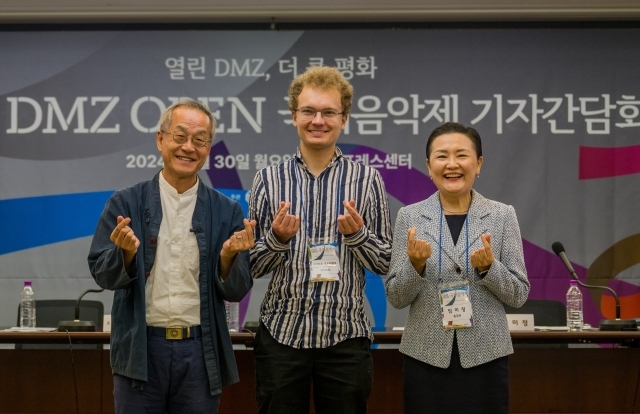 지난 9월 30일 ‘제2회 DMZ 오픈 국제음악제’ 기자간담회’에서 최재천 DMZ 오픈 페스티벌 조직위원장(왼쪽부터), 우크라이나 바이올니스트 드미트로 우도비첸코, 임미정 총감독이 포즈를 취하고 있다. 경기관광공사 제공