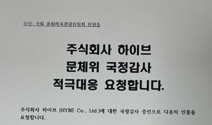 팬들은 방시혁 의장 외에 이재상 하이브 CEO(최고경영자), 박태희 하이브 CCO(최고홍보책임자), 정진수 하이브 CLO(최고법률책임자) 등을 문체위가 국감 증인으로 불러달라고 팩스에서 요구했다.