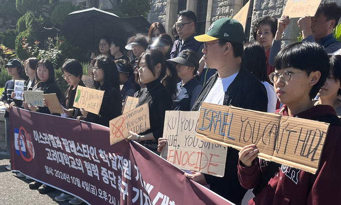 고려대 문화 편집위원회와 민주학생기념사업회, 생활도서관 등 교내 단체들은 4일 서울 성북구 고려대 서울캠퍼스에서 기자회견을 열고 이스라엘의 전쟁범죄를 옹호해 온 기관·기업과의 협력을 끊어야 한다고 주장했다.