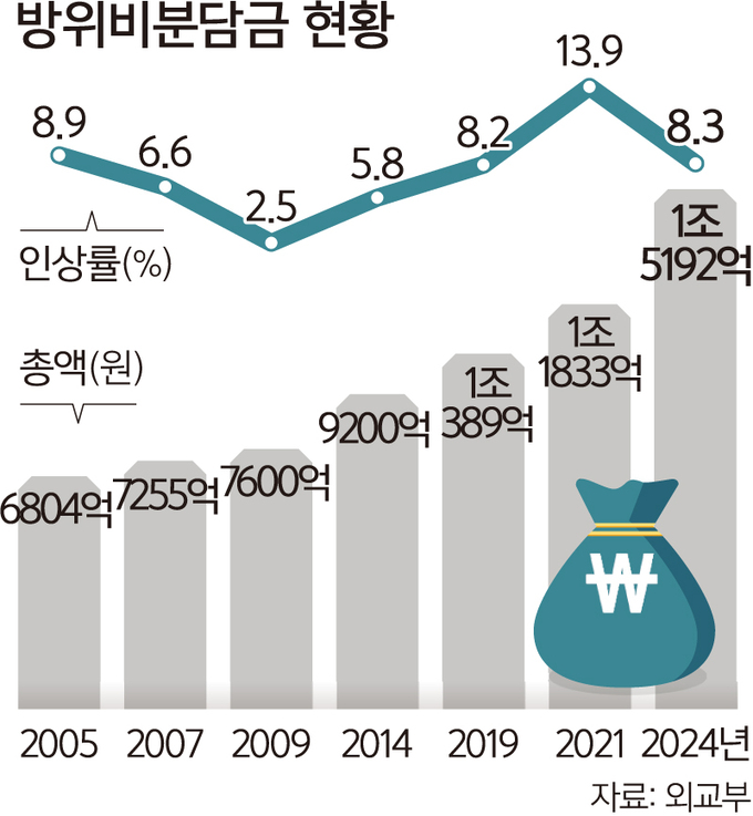 6일 외교부에 따르면 한·미 협상단은 지난 4월 공식 협의를 시작한 이래 약 5개월간 합의를 진행한 결과, 지난 1∼2일 서울에서 연장으로 개최된 8차 회의에서 협상을 최종 타결했다. 외교부는 협상 결과를 알리고 양측이 협정 본문 및 이행약정 문안에 최종 합의했다고 밝혔다. 합의 내용은 최초 연도(2026년) 분담금 총액이 1조5192억원으로, 2025년(1조4028억원) 대비 8.3% 증액된다. 인건비, 군사건설, 군수지원이라는 지원항목 틀을 유지한 채 미 측이 제기한 소요에 기반해 분담금 규모를 협의한 것이다.