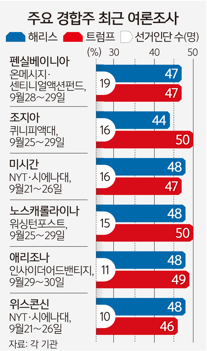 조지아(선거인단 16명)에서는 최근 트럼프 전 대통령이 다소 앞서가는 경향을 보인다. 9월25∼29일 퀴니피액대 여론조사에서 해리스 부통령은 44%, 트럼프 전 대통령은 50%를 기록했다. 역시 16명의 선거인단을 가진 미시간은 9월21∼26일 NYT·시에나대 여론조사에서 해리스 부통령이 48%, 트럼프 전 대통령이 47%로 다소 앞서갔다. 2020년 대선에서 트럼프 전 대통령이 유일하게 이긴 경합주이자 15명의 선거인단을 가진 노스캐롤라이나에서는 9월25∼29일 워싱턴포스트 여론조사에서 트럼프 전 대통령이 50%, 해리스 부통령이 48%로 트럼프 전 대통령이 앞서가고 있다.