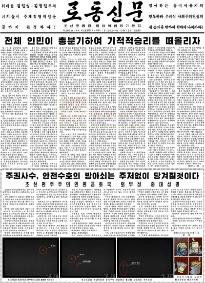 북한 노동당 기관지 노동신문은 12일 북한 외무성이 전날 발표한 '주권사수, 안전수호의 방아쇠는 주저없이 당겨질 것이다' 제하의 '중대 성명'를 싣고 한국이 지난 3일, 9일, 10일 심야시간을 노려 무인기를 평양 상공에 침범시켜 삐라를 살포했다고 밝혔다. 사진=평양 노동신문/뉴스1