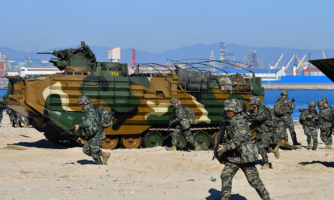 지난 2023년 11월 21일 경북 포항시 남구 도구해안에서 실시된 2023호국합동상륙훈련에서 적 해안에 상륙한 해병대원들이 돌격하고 있다. 뉴스1