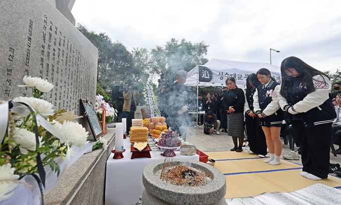 21일 서울 성수대교 북단에 위치한 성수대교 참사 희생자 위령탑 앞에서 성수대교 붕괴사고 30주기 합동위령제가 열린 가운데, 무학여고 학생 등이 헌화한 뒤 묵념하고 있다. 1994년 10월21일 오전 7시40분쯤 성수대교가 붕괴해, 버스 등을 타고 다리를 건너던 무학여고 학생 8명을 포함해 시민 32명이 사망하고 17명이 다쳤다. 위령탑은 성수대교 북단 나들목의 빈 공간에 외따로 위치해 있어, 접근을 위해선 도로를 무단횡단해야 한다. 교통사고 등의 우려로 위령탑을 서울숲으로 이전해 달라는 유족 등의 요구가 끊이지 않는다.
