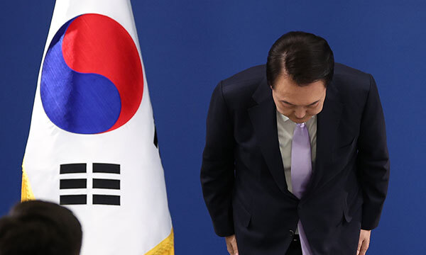 윤석열 대통령이 어제 대국민 담화 및 기자회견에서 “제 주변의 일로 국민께 걱정과 염려를 드렸다”며 “국민 여러분께 죄송하다는 말씀, 진심 어린 사과의 말씀을 드린다”고 했다. 이 과정에서 단상 앞으로 나와 서서 머리를 숙였다. 윤 대통령이 국민에게 고개를 숙여 사과한 것은 취임 후 처음이다. 윤 대통령은 또 “저와 정부의 부족한 부분을 잘 알고 있다. 고쳐야 할 부분들을 고쳐 나가겠다”고 강조했다.