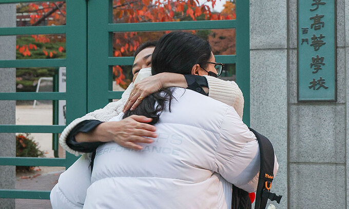 2025학년도 대학수학능력시험 당일인 14일 서울 중구 이화여자외국어고등학교에서 수험생들이 가족들의 배웅을 받으며 입실하고 있다.