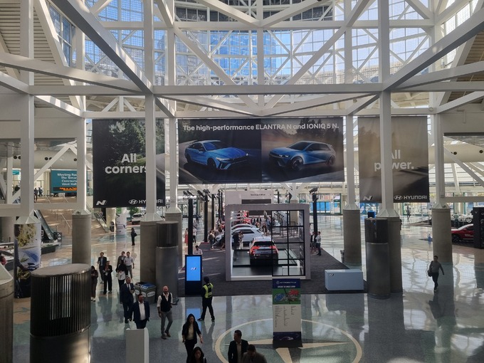 전시장 안에서도 현대차의 부스는 중앙에서 관객들의 시선을 사로잡았다. 이번 LA 오토쇼에서 현대차는 약 4193㎡ 규모의 전시 공간을 마련했다. 엘란트라, 쏘나타, 쏘나타 하이브리드, 디 올 뉴 싼타페 하이브리드 등 총 42대의 차량으로 공간을 꾸렸다. 이오닉5N, 아이오닉6, 아이오닉5, 아이오닉9을 동승 체험할 수 있는 실내 ‘EV 시승 체험존’도 마련됐다.