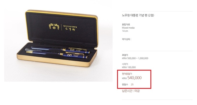 노 전 대통령 이름이 들어간 기념펜 세트 최종 낙찰가는 54만원이다. 응찰 횟수는 총 25회로 시작가 10만원의 다섯 배가 넘는 가격에 주인이 정해졌다.