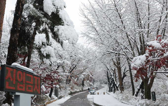 이틀 연속 많은 눈이 내린 28일 서울 남산 산책로에 차량이 통제되고 있다. 서울·경기 지역에선 지난 하루동안 40㎝안팎의 눈이 쌓이는 등 117년만에 11월 가장 많은 눈이 내렸다. 기상청은 이날 오전 10시 서울 전역에 내렸던 대설경보를 해제했다.