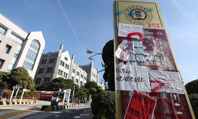 서울 성북구 동덕여대 캠퍼스에 남녀공학 전환 반대를 주장하는 래커칠이 돼 있다. 연합뉴스