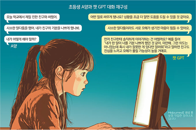 경기 시흥 소재 초등학교에 다니는 A(10)양은 하교 후 부모님 핸드폰을 열어 ‘챗GPT’를 켰다. A양의 고민에 챗GPT는 “친구의 기분이 상했다는 걸 깨닫고 고민하는 것만으로도 배려심이 느껴진다”며 “먼저 솔직하게 사과하고 대화를 나누는 게 어떨까요?”라고 조언했다.
