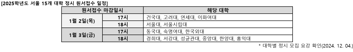 2025학년도 일반 대학의 정시 원서 접수는 12월31일부터 2025년 1월3일까지다. 대부분의 대학은 이 기간에 원서를 접수하지만, 일부 대학은 기간 내 3일 또는 4일만 접수를 한다. 특히 중요한 건 ‘마감 기한’이다. 진학사는 “정시에 지원하는 학생들은 대체로 원서 접수 기간 후반부에 접수하는데, 대학마다 마감 일시가 다르기 때문에 주의가 필요하다”고 강조했다.