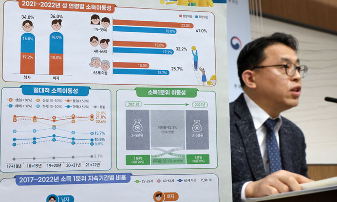‘개천에서 용 나기 힘든 사회가 됐다’는 말을 실감할 수 있는 통계가 나왔다. 통계청이 어제 발표한 ‘2017∼2022년 소득이동통계 개발결과’에 따르면 2022년 기준 소득 분위가 1년 전보다 상승한 국민은 10명 중 2명도 채 되지 않았다. 5년 주기로 보면 그 비율이 2018년 18.1%에서 2022년 17.6%로 떨어졌다. 공교롭게 이 시기는 문재인정부의 집권기와 겹친다. 서민의 지갑을 두툼하게 해 소비와 성장을 유도한다는 문정부의 소득주도성장이 외려 계층이동의 사다리를 망가트렸고 빈곤의 고착화도 초래했다는 지적을 피할 길이 없다.