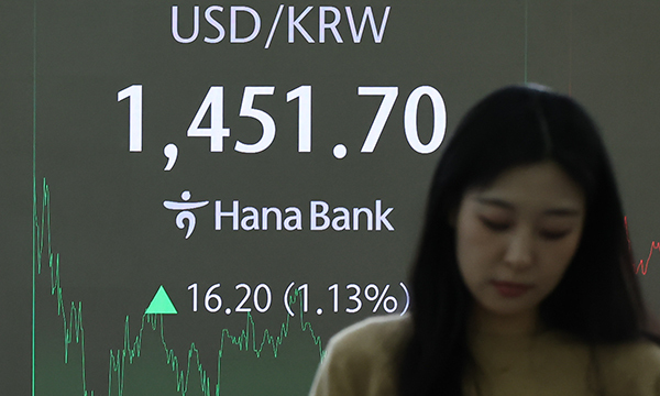 서울 외환시장에서 이날 원·달러 환율은 전날보다 17.5원 상승한 1453.0원으로 출발해 1450원 아래에서 움직이다가 1451.9원에 주간거래(오후 3시30분)를 마쳤다. 장중 환율이 1450원을 웃돈 것은 2009년 3월16일 장중 최고 1488.0원을 기록한 이후 처음이다.