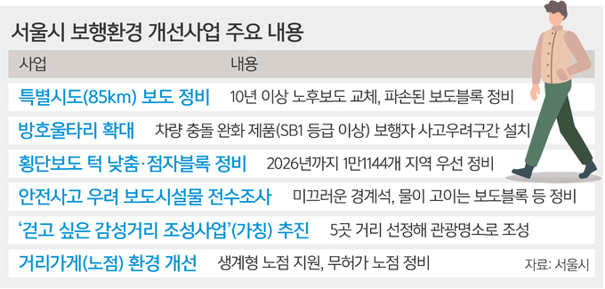 서울시가 내년 올림픽대로의 약 2배 길이인 85㎞에 달하는 도심 내 보도를 대대적으로 정비한다. 파손된 보도블록을 정비하고, 10년 이상 된 노후보도는 교체한다. ‘시청역 역주행 사고’ 재발을 막기 위한 ‘보도용 차량 방호울타리’도 설치한다.