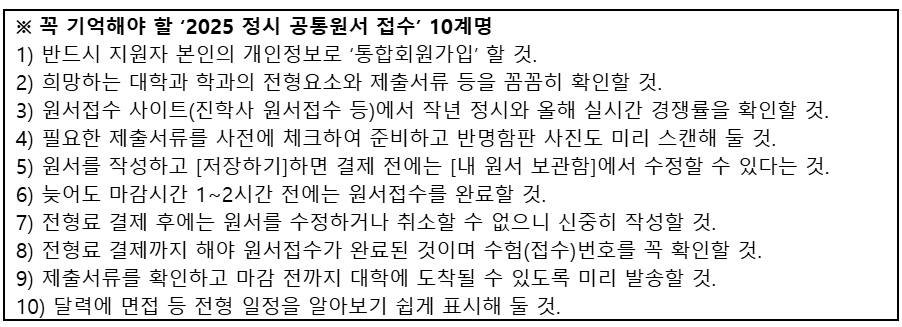 12월31일부터 2025학년도 대입 정시 원서 접수가 시작된다. 원서 접수 마감일은 일반대학은 내년 1월3일, 전문대는 1월14일이다. 진학사가 원서접수를 앞두고 수험생들이 확인해야 할 사항을 Q&A 형식으로 정리했다.