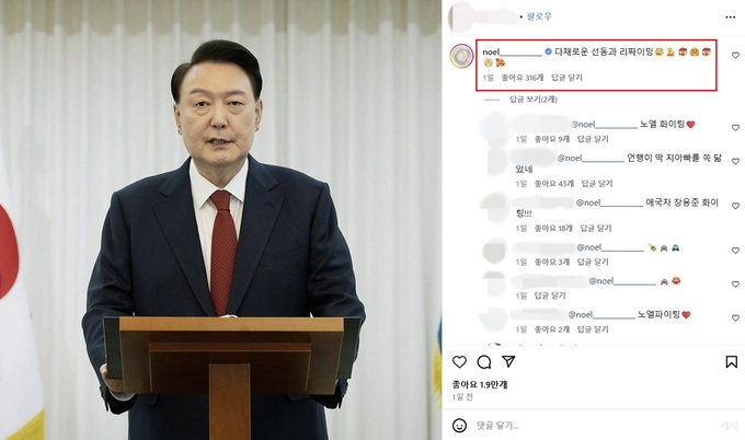 노엘은 30일 한 매거진의 사회관계망서비스(SNS) 계정에 올라온 “내란 사태를 수사 중인 공조수사본부가 윤석열 대통령 체포영장을 청구했다”는 글에 ‘리짜이밍’이라는 표현을 더해 이같이 날을 세웠다. 그는 ‘역겹다’며 해당 소식을 전한 매체도 비판했다. ‘리짜이밍’은 이재명 더불어민주당 대표 이름의 중국식 발음으로 이 대표를 비난하는 쪽에서 주로 사용한다.