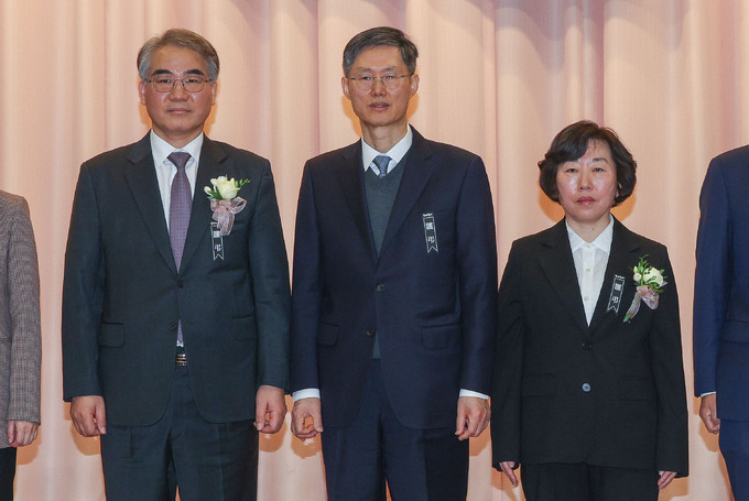 문형배 헌법재판소장권한대행과 헌법재판관들이 2일 서울 종로구 헌법재판소에서 열린 정계선·조한창 헌법재판관 취임식 및 시무식에서 기념촬영을 하고 있다.