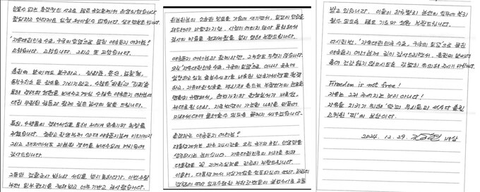 김 전 장관의 1심 첫 공판 준비 기일은 오는 16일 서울중앙지법 형사25부(재판장 지귀연) 심리로 열린다. 다음은 김 전 장관 변호인단이 2일 공개한 김 전 장관의 옥중서신 전문.