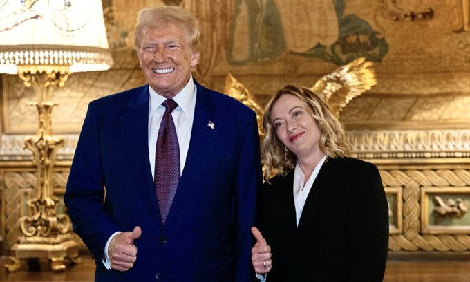 도널드 트럼프 미국 대통령 당선인(왼쪽)과 조르자 멜로니 이탈리아 총리가 4일(현지시간) 미국 플로리다주 팜비치 마러라고 리조트에서 기념촬영하고 있다. ‘트럼프 절친’으로 주가를 올리고 있는 멜로니 총리는 이날 예고없이 미국을 방문해 취임식을 2주 앞둔 트럼프 당선인과 회동한 것으로 알려졌다.