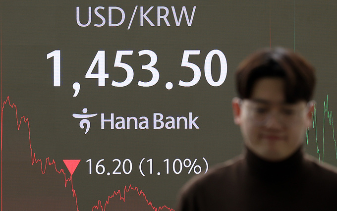 7일 서울 외환시장에서 원·달러 환율은 16.2원 내린 1453.5원에 주간거래(오후 3시30분)를 마쳤다. 장중 한때 1449.8원까지 하락, 1450원을 밑돌기도 했다. 이로써 환율은 지난해 12월23일 이후 8거래일 만에 1440원대로 처음 내려섰는데, 주간거래 종가 역시 당시(1452.0원) 이후 가장 낮은 수준이다. 이날 야간거래(오전 2시) 종가는 전날 주간거래 종가보다 9.2원 내린 1459.2원이었다.