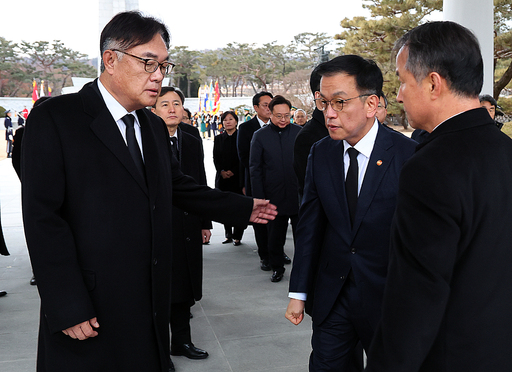 최상목 대통령 권한대행 부총리 겸 기획재정부 장관과 정진석 대통령 비서실장이 2025년 을사년 새해 첫날인 1일 서울 동작구 국립서울현충원을 찾아 현충탑 참배 뒤 대화를 나누고 있다. 뉴시스