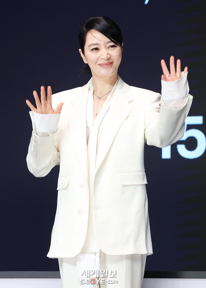 배우 김혜수가 8일 서울 영등포구 콘래드 서울에서 열린 디즈니+ '트리거(감독 유선동)' 제작발표회에 참석해 포즈를 취하고 있다.