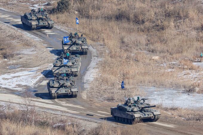 23일 경기도 포천시 소재 승진과학화훈련장에서 올해 처음 열린 ‘혹한기 공지합동 통합화력 운용 훈련’에서 한국군의 주력전차인 K1E1 전차가 기동하고 있다. 이날 훈련에는 육군 17사단 장병 400여명과 함께 K1E1 전차, K808 차륜형장갑차, K200A1 장갑차 등 90여대의 육군 장비가 투입됐으며, 공군작전사령부 예하 F-15K, KF-16, FA-50 등 전투기 12대도 참가했다.