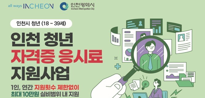인천시가 지역 청년들이 자신감을 갖고 미래를 준비할 수 있도록 돕는다. 시는 미취업 청년들의 경제적 부담 완화 차원에서 자격증, 어학 등 시험 응시료를 지원한다고 31일 밝혔다.