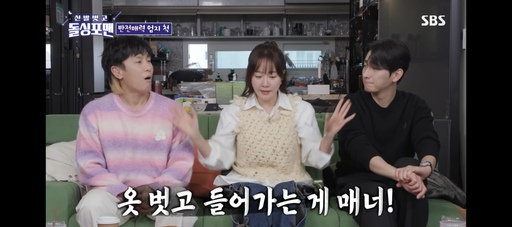 그룹 '룰라' 멤버이자 '돌싱포맨' 호스트인 이상민이 "옷을 입고 들어가는 줄 알았다"고 반응하자 "아니다. 그러면 매너가 없는 것"이라고 재차 강조했다.