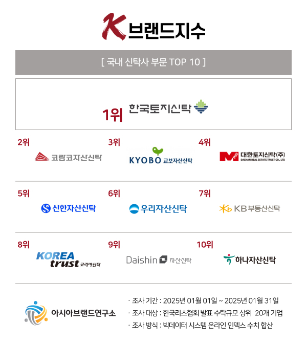 ‘K-브랜드지수’ 신탁사 부문은 1위 한국토지신탁에 이어 코람코자산신탁(2위), 교보자산신탁(3위), 대한토지신탁(4위), 신한자산신탁(5위), 우리자산신탁(6위), KB부동산신탁(7위), 코리아신탁(8위), 대신자산신탁(9위), 하나자산신탁(10위)이 TOP10의 영예를 차지했다.
