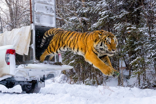 4일(현지시간) 러시아 프리모르스키(연해주)에서 시베리아 호랑이가 야생으로 돌아가고 있다. 이 호랑이는 지난 2일 포획돼 위치정보시스템(GPS) 추적 장치를 착용한 후 자연으로 방사됐다.