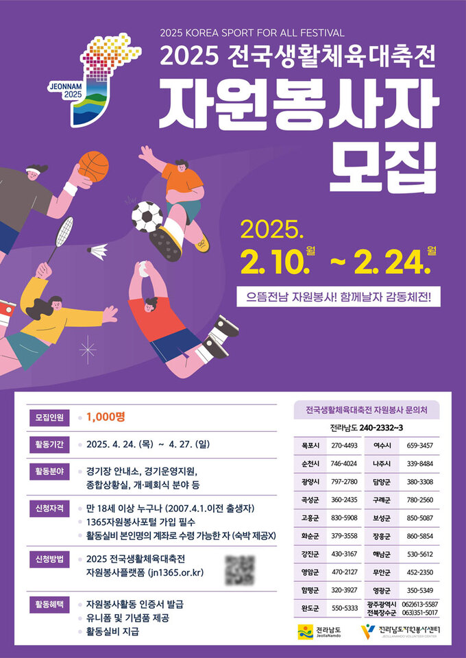 자원봉사자 모집 기간은 오는 10일부터 24일까지 15일간이다. 지원 자격은 18세 이상 누구나 가능하다. 신청은 ‘2025 전국생활체육대축전 자원봉사 플랫폼(jn1365.or.kr)’에서 온라인으로 접수하거나, 각 개최 시군 자원봉사센터를 방문해 신청할 수 있다.