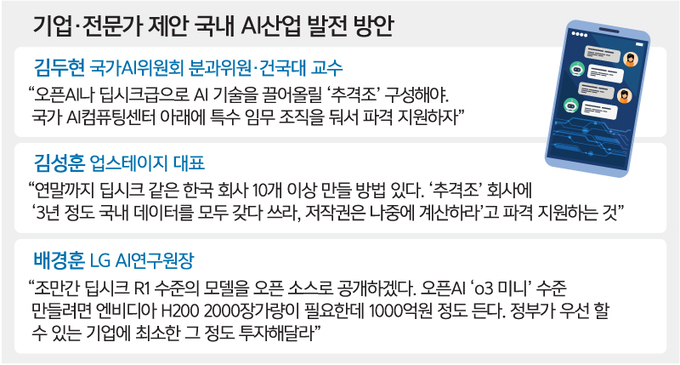국가AI위원회 분과위원인 김두현 건국대 컴퓨터공학과 교수는 “오픈AI나 딥시크 급으로 AI 기술을 끌어올릴 수 있는 추격조를 구성해야 한다”며 “(곧 만들어질) 국가 AI컴퓨팅센터 산하에 특수 임무 조직을 둬서 제도에 묶이지 않고 파격적으로 지원해야 한다”고 제언했다.