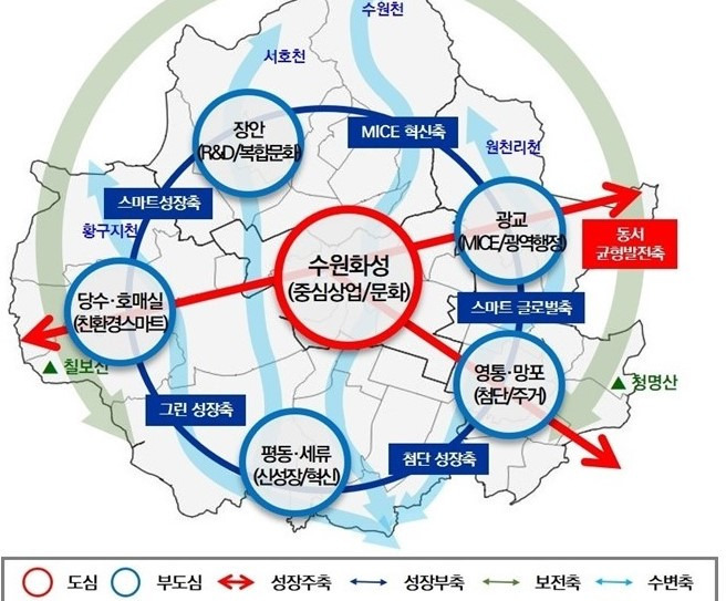 우선 수원 역세권에선 업무와 상업, 관광, 문화, 주거가 복합적으로 결합하는 개발이 추진된다. 도시 생활권은 △수원화성-화성생활권 △장안-북수원생활권 △당수·호매실-서수원생활권 △평동·세류-남수원생활권 △영통·망포-영통생활권 △광교생활권의 6개 권역으로 특색있게 꾸려진다.