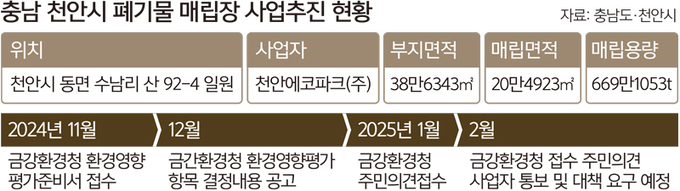 이 같은 사실이 알려지자 인접 천안시 동면 주민들과 충북 청주시 청원구 오창읍 주민들은 매립장설치 인허가를 반대하며 반발하고 있다.