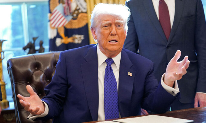 트럼프 대통령은 14일(현지시간) 백악관 집무실(오벌 오피스)에서 행정명령 서명식을 하면서 취재진이 자동차 관세 도입 일정을 묻자 "아마도 4월 2일께"라고 답했다.
