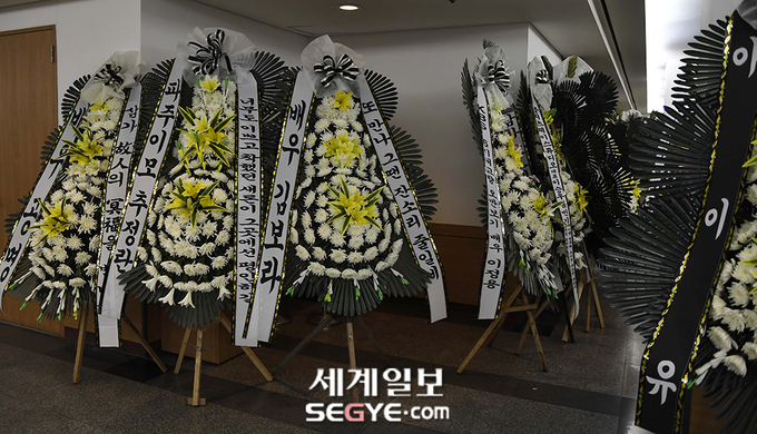 갑작스럽게 세상을 떠난 영화배우 故김새론의 빈소가 17일 서울 송파구 서울아산병원 장례식장에 마련된 가운데 동료 배우들의 근조화한이 놓여져 있다.