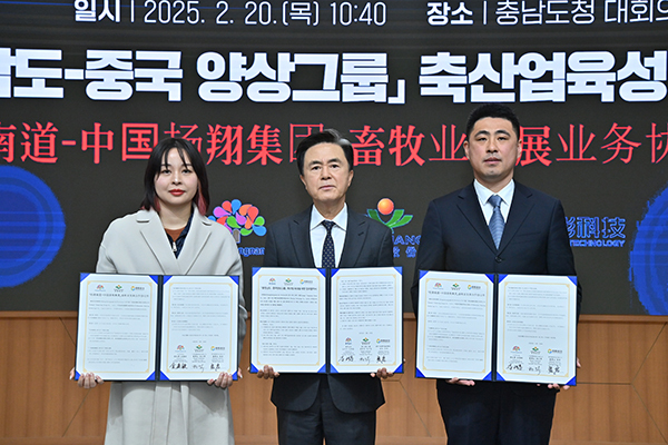김태흠 지사는 20일 도청 대회의실에서 양쓰팅 광시 양샹그룹 총회장, 장옌 심천 수잉과학기술유한회사 회장과 축산업 육성을 위한 업무협약을 체결했다.