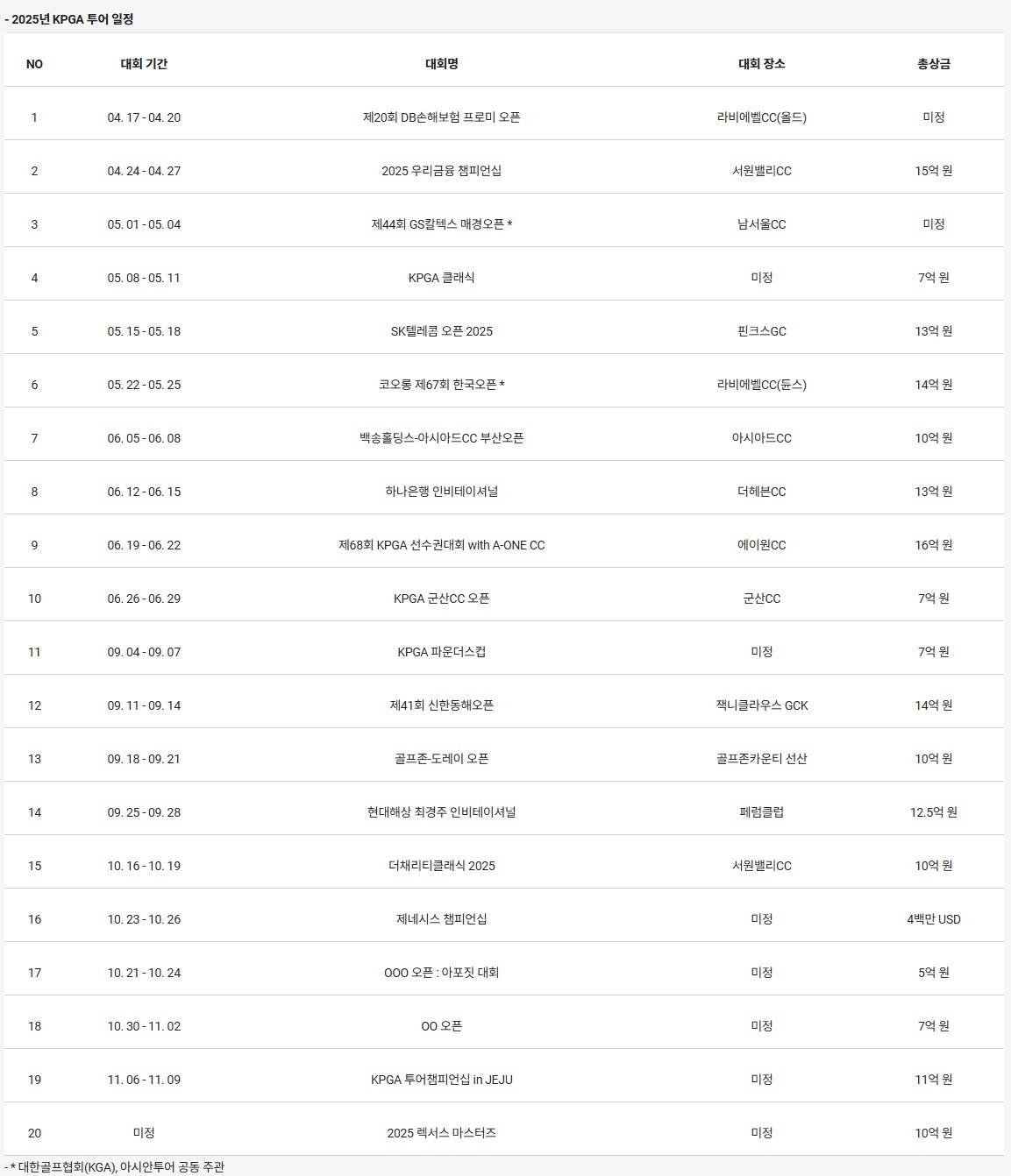 2025시즌 한국프로골프(KPGA) 투어에서는 20개 대회가 펼쳐진다. 상금은 모두 259억원이 걸려있다.