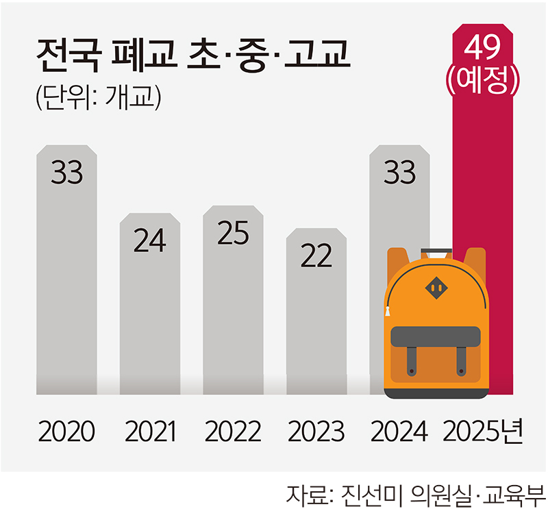 폐교 학교는 2020년 33개교에서 2021년 24개교로 떨어졌고, 2022년 25개교, 2023년 22개교 등 매년 20여곳을 기록하다가 지난해 다시 33개교로 증가했고 올해에는 49개교까지 뛰었다.