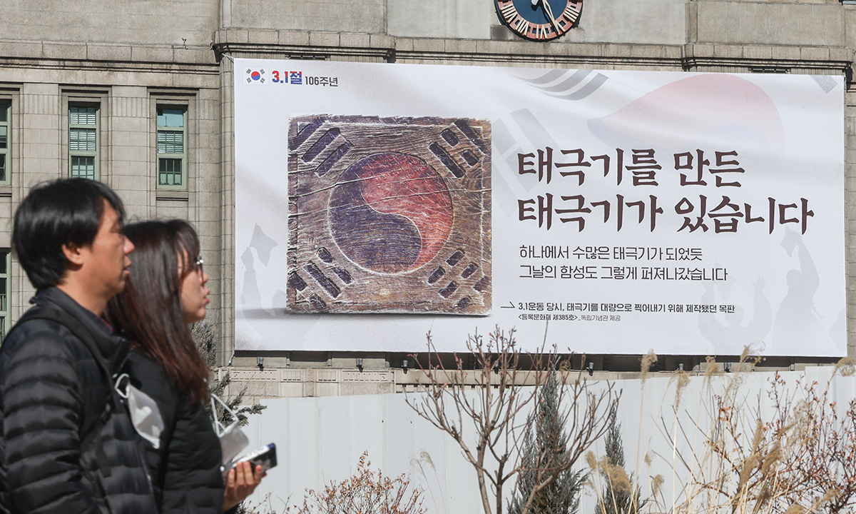 26일 서울 중구 서울시청 외벽 서울꿈새김판에 3·1절 106주년 기념 글귀로 ‘태극기를 만든 태극기가 있습니다’가 새겨져 있다. 서울시는 이번 꿈새김판 전면에 펄럭이는 태극기 이미지와 함께 1919년 3월1일 독립운동 당시 태극기를 대량으로 찍어 내기 위해 제작됐던 국가등록문화재 제385호 태극기 목판 사진을 넣었다.