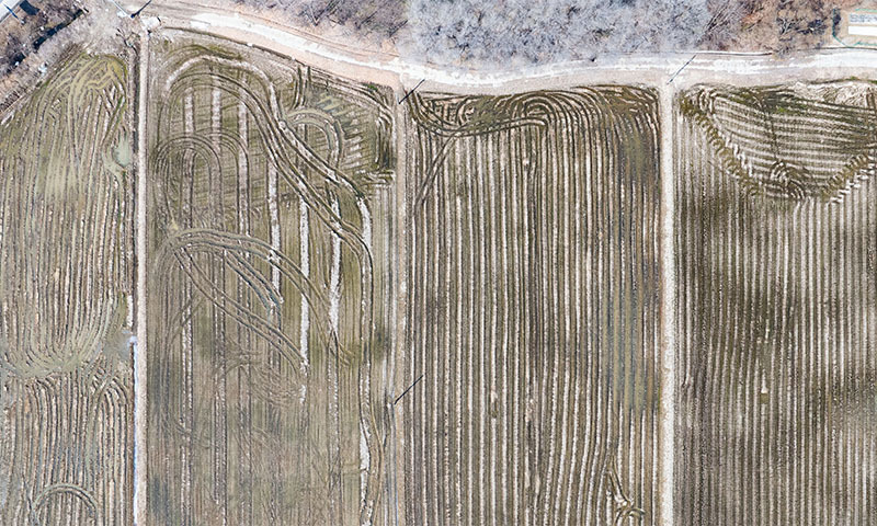 놀랠 경(驚)자와 겨울잠을 자는 벌레 칩(蟄)자를 써 만물이 겨울잠에서 깨어나는 시기인 경칩이 하루 지났다. 이즈음이 되면 겨울철의 대륙성 고기압이 약화되고 이동성 고기압과 기압골이 주기적으로 통과하게 되어 춥고 더움이 반복된다. 그리하여 기온은 날마다 상승하며 마침내 봄으로 향하게 된다. 농사를 주업으로 삼았던 우리 선조들에게 봄의 시작을 알리는 경칩은 본격적인 한 해 농사 준비를 시작하는 매우 중요한 절기 중 하나였다. 겨우내 변소에 쌓인 인분을 퍼내 두엄을 섞어 거름을 만들 준비를 하는 시기이다. 경기 안성 일죽면의 농지에서도 봄을 맞이하는 모습이 포착됐다. 한 해 농사를 앞둔 논에는 비료 포대가 간격 맞춰 정갈하게 놓여있었고, 논과 밭은 땅을 고른 흔적들로 아름다운 문양을 만들어냈다.