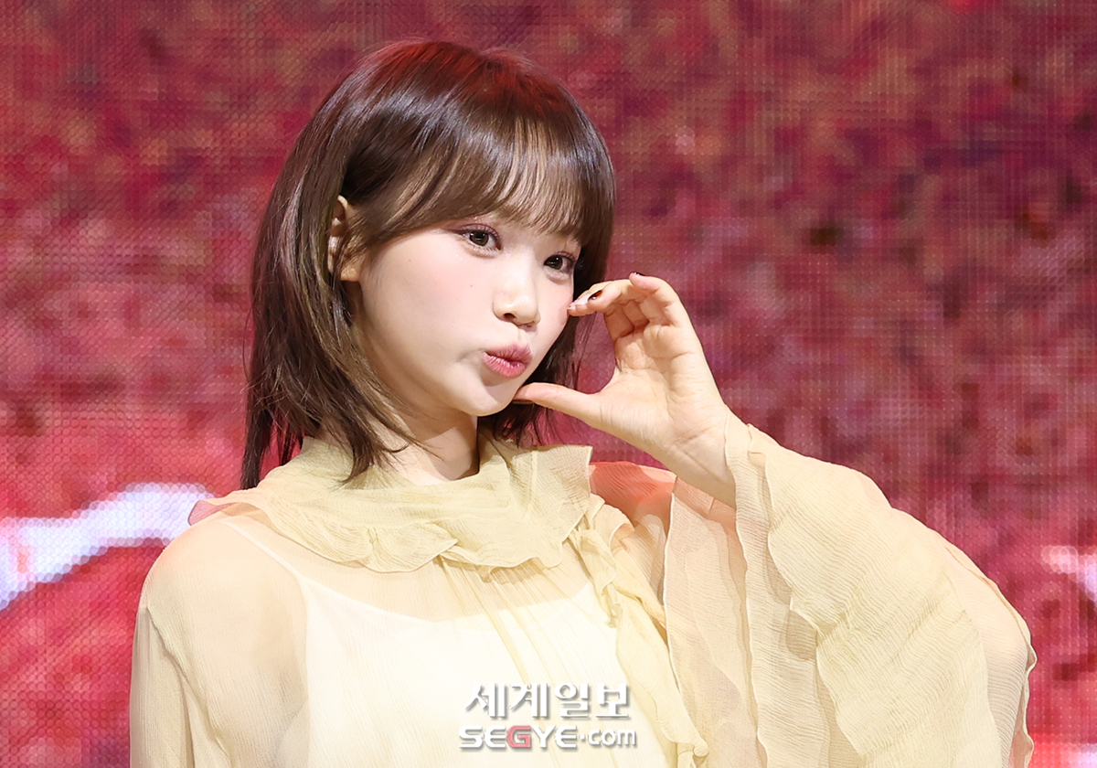 그룹 르세라핌 김채원이 14일 서울 광진구 광장동 예스24 라이브홀에서 열린 미니 5집 ‘HOT’ 쇼케이스에 참석해 포즈를 취하고 있다.