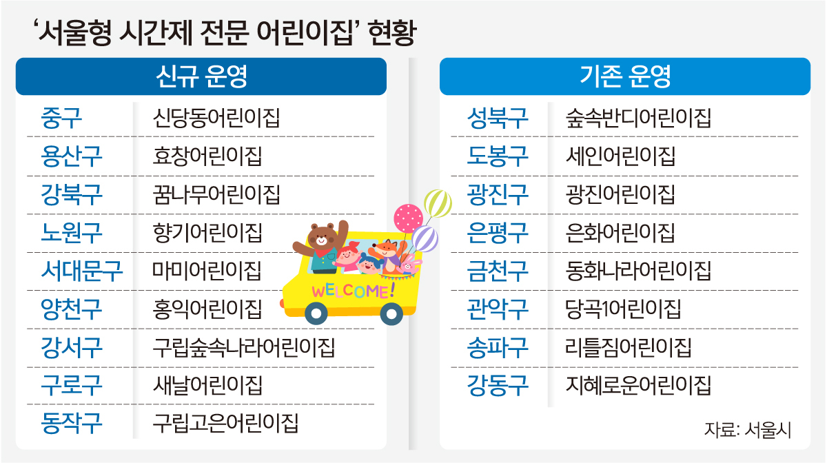 부모가 급한 일이 생겼거나 집안일 또는 재충전을 할 시간이 필요할 때 미취학 자녀를 시간 단위로 맡길 수 있는 서울시의 ‘서울형 시간제 전문 어린이집’이 연내 25개 전 자치구로 확대된다. 주 양육자의 피로도는 줄이고 맞벌이 가정의 단기간 돌봄 공백을 해소하는 데 도움이 될 것으로 기대된다.