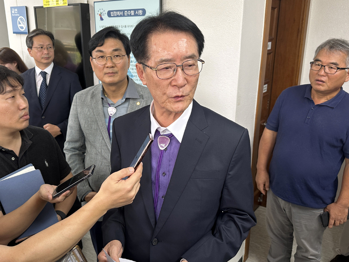 박우량 전남 신안군수가 지난 2024년 9월6일 광주지법에서 열린 직권남용 혐의 항소심 재판에서 당선무효형을 선고받은 뒤 입장을 밝히고 있다. 광주=연합뉴스