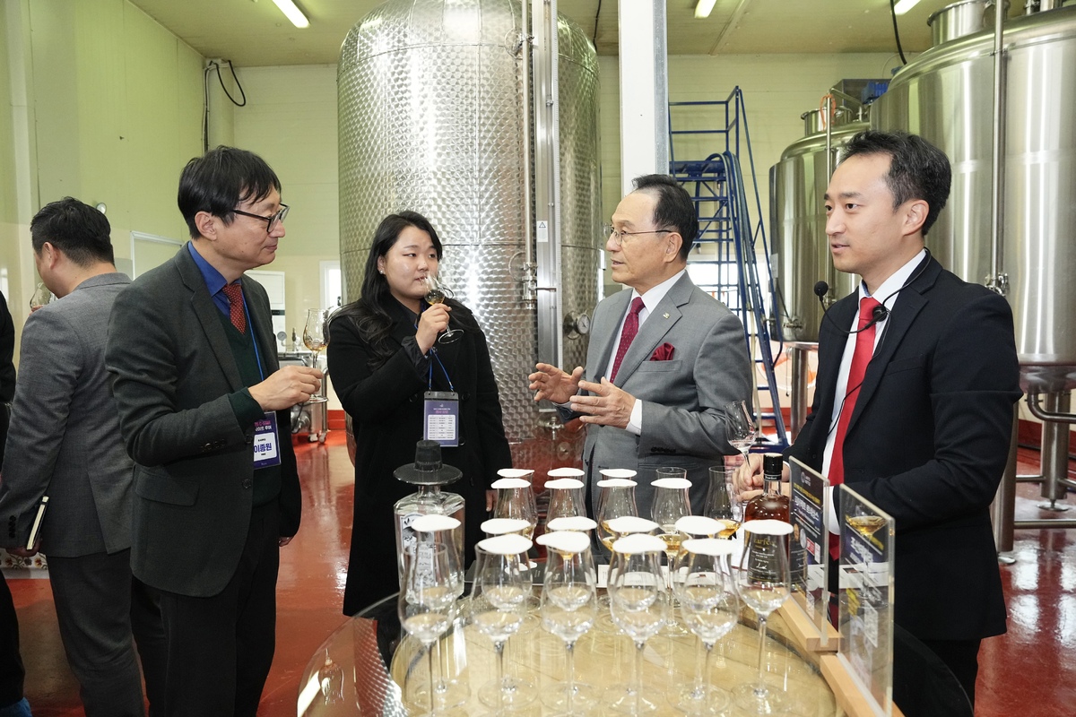랩투보틀은 업계 유일의 기술기반 양조 스타트업이다. 혁신적 기술을 바탕으로 발효·숙성의 효율을 극대화하며 세계 3대 주류 품평회인 ‘2024 영국 IWSC’에서 동상을 수상한 이력을 갖고 있다. 주력 상품인 ‘피어펙트(pearfect)’는 천안 대표 특산물인 ‘성환 배’를 활용한 증류주로, 지역 농민들과의 지속적인 상생을 도모하고 있다. 참석자들은 랩투보틀이 보유한 지역 최대 증류시설을 견학하고, 제품생산 과정에 대한 설명을 들었다.