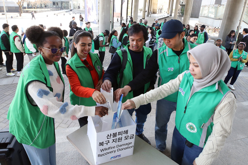 2일 경북 경산시 영남대 박정희새마을대학원에서 열린 ‘경북 산불 피해 복구 지원 모금’ 행사에서 외국인 유학생들이 성금을 내고 있다.