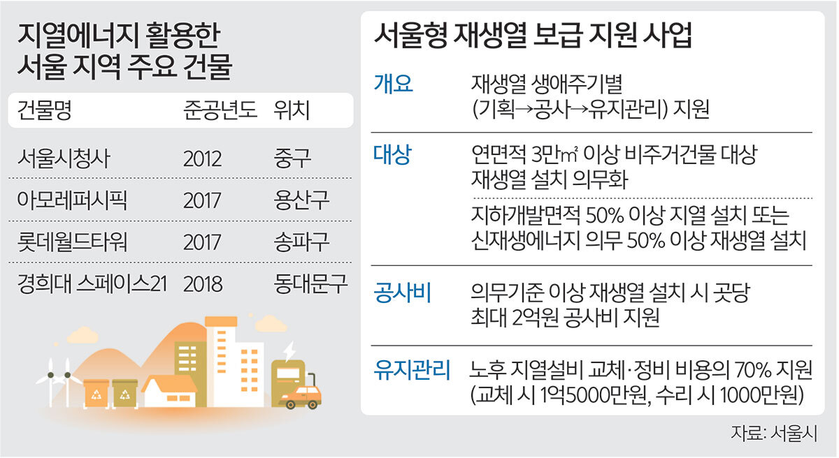 전문가 사이에서는 서울이 재생열에너지 보급 최적지로 꼽힌다. 서울은 땅의 온도가 일정하고, 한강과 곳곳에 지류 하천을 끼고 있어 수자원 재생열 보급이 용이하기 때문이다. 반면 일조량은 적고 풍속이 낮아 태양광과 풍력에는 한계가 있다. 건물이 밀집해 설치부지가 부족하고, 생활권 내 소음 발생 등 문제도 발생한다. 이 같은 단점 없이 도심에서도 안정적인 공급이 가능한 지열이 친환경 시대 대안으로 떠오르는 이유다. 지열 시스템은 실외기 등의 외부 냉각장치가 없어 진동과 소음이 발생하지 않는다. 시는 2030년까지 서울 지역 지열 1000㎿, 수열 181㎿ 보급을 목표로 하고 있다.